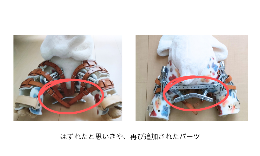実は、第二形態にする際に 足の下を支えていた太いバー(鉄製パーツ)が外れる のですが、それによって固定力が弱まり装具がズレたようでした。