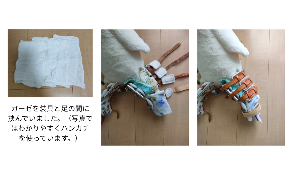 - ガーゼを片足3枚ほど使って、足と装具の間に挟む方法 → フィット感・通気性・交換のしやすさで最終的にコレに落ち着きました