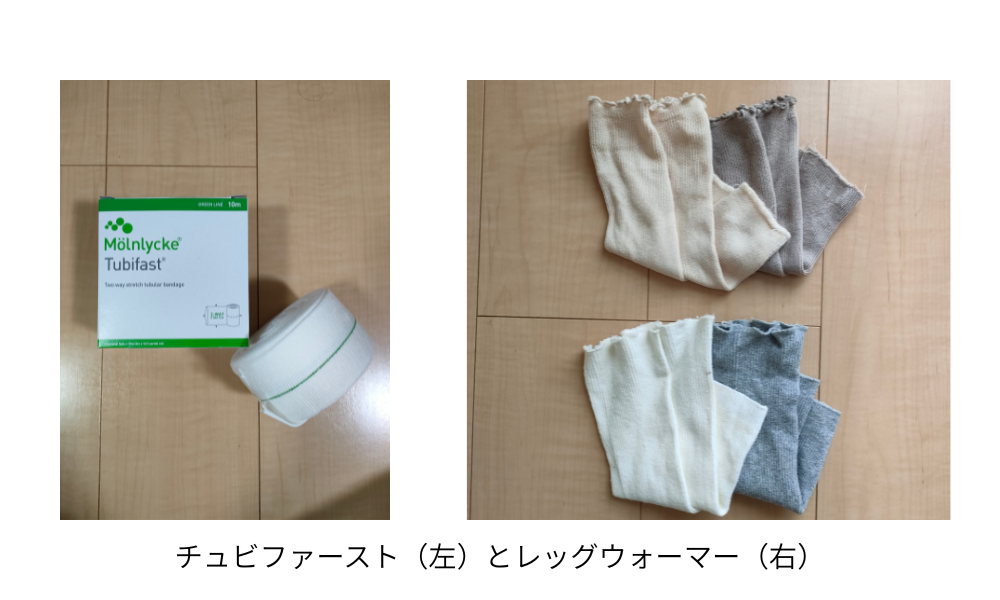 - チュビファースト2way(緑) → 医師から勧められた医療用チューブ包帯。薄手で摩擦減少に良いが、太ももがムチムチで少しきつかった。(サイズ違いもあります)